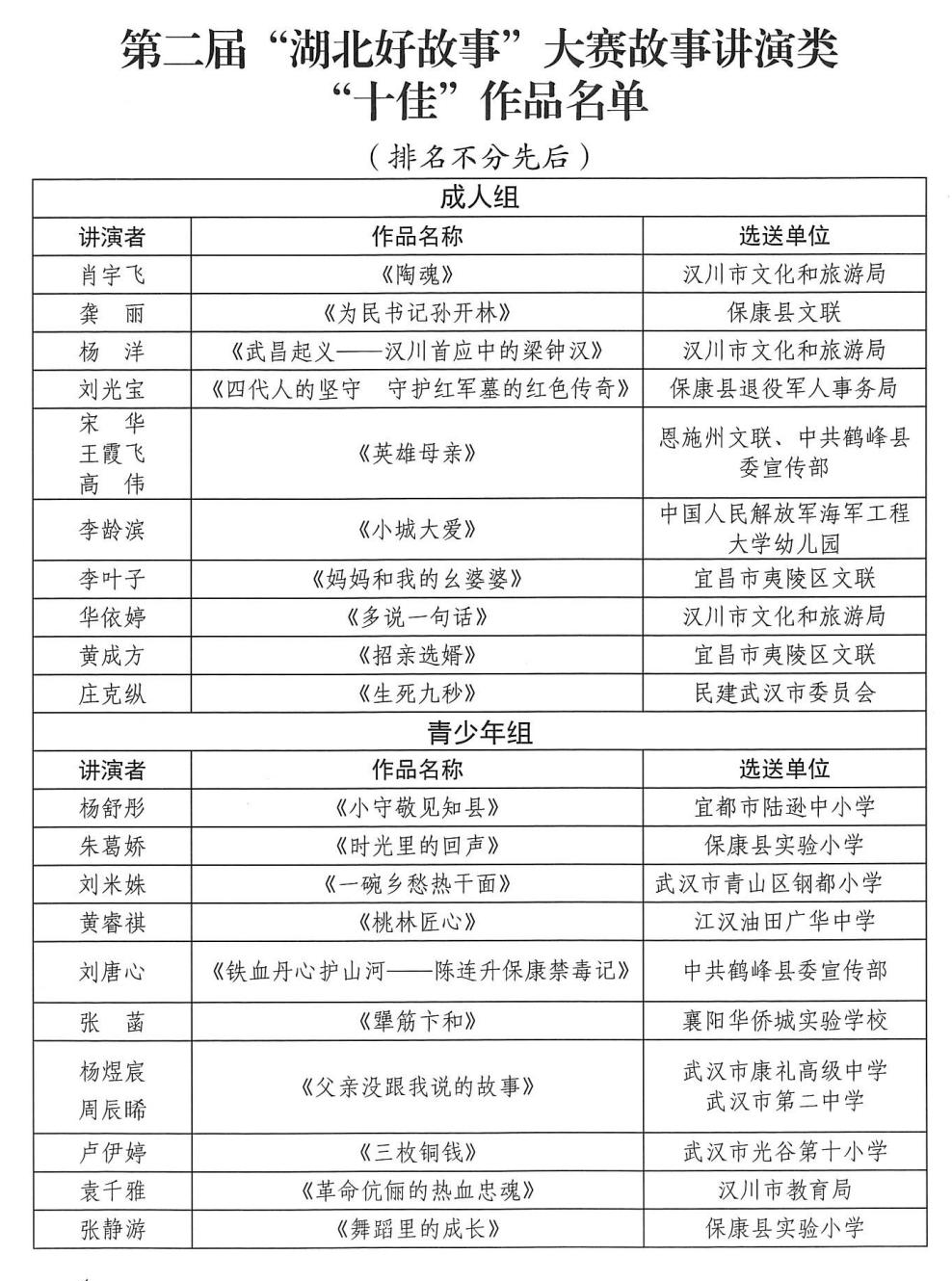 第二届“湖北好故事”大赛“十佳”作品、“十佳”入围作品、综合等次奖作品名单通知见下表。