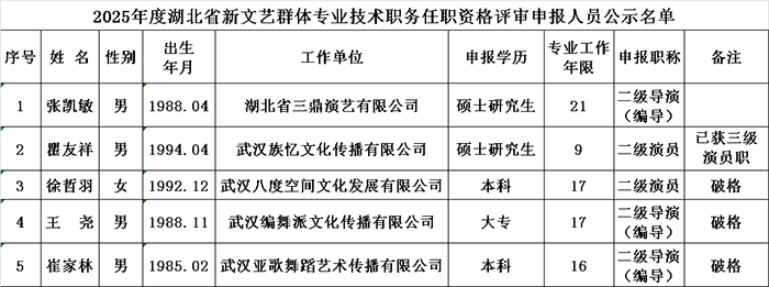 附件:2025年度湖北省新文艺群体专业技术职务任职资格评审申报人员公示名单