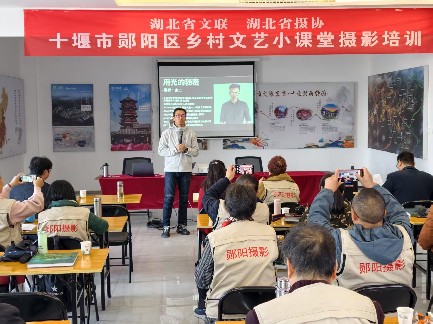 为深入贯彻落实习近平文化思想和宣讲党的二十届四中全会精神,推动优质文艺资源直达基层,让基层文艺工作者在本地也能享受优质培训课程资源。2025年11月28日至29日,湖北省文联、湖北省摄协、十堰市文联、郧阳区文联联合在文艺聚居区汉水九歌街区举办“乡村文艺小课堂”摄影培训活动。