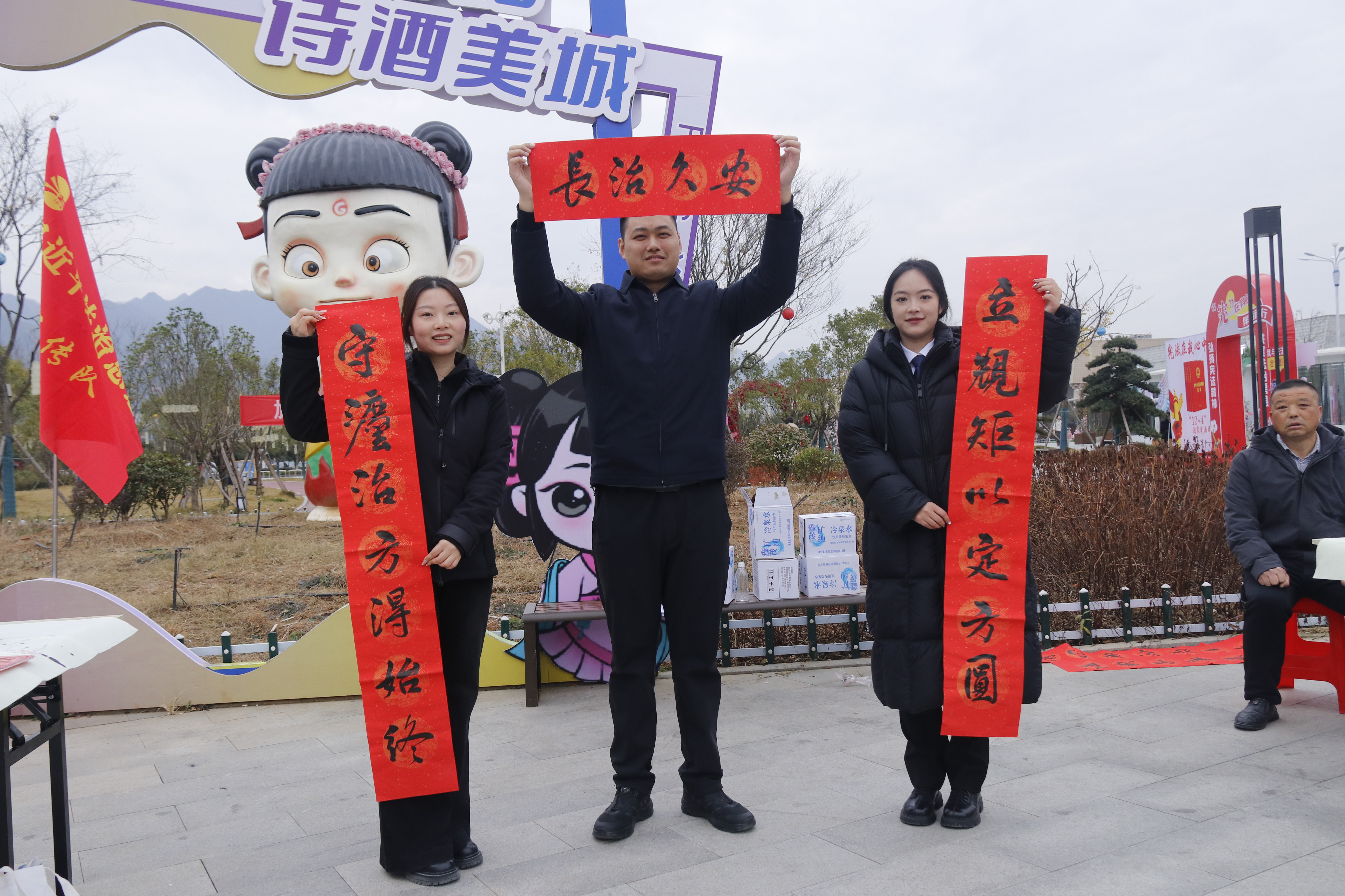 活动现场,程道略、王连甫、赵华丽、常涛、宋青艳、谭毅等书法家、美术家在备好笔墨纸砚的案台上,为群众创作书画作品和对联。“我们作为执法部门,可否结合写一副对联?”面对群众的个性化需求,艺术家们一一应允,凝神挥毫。“立规矩以定方圆,守法治方得始终”,接过书法家创作的对联,3位年轻人高兴地要求现场留影纪念。