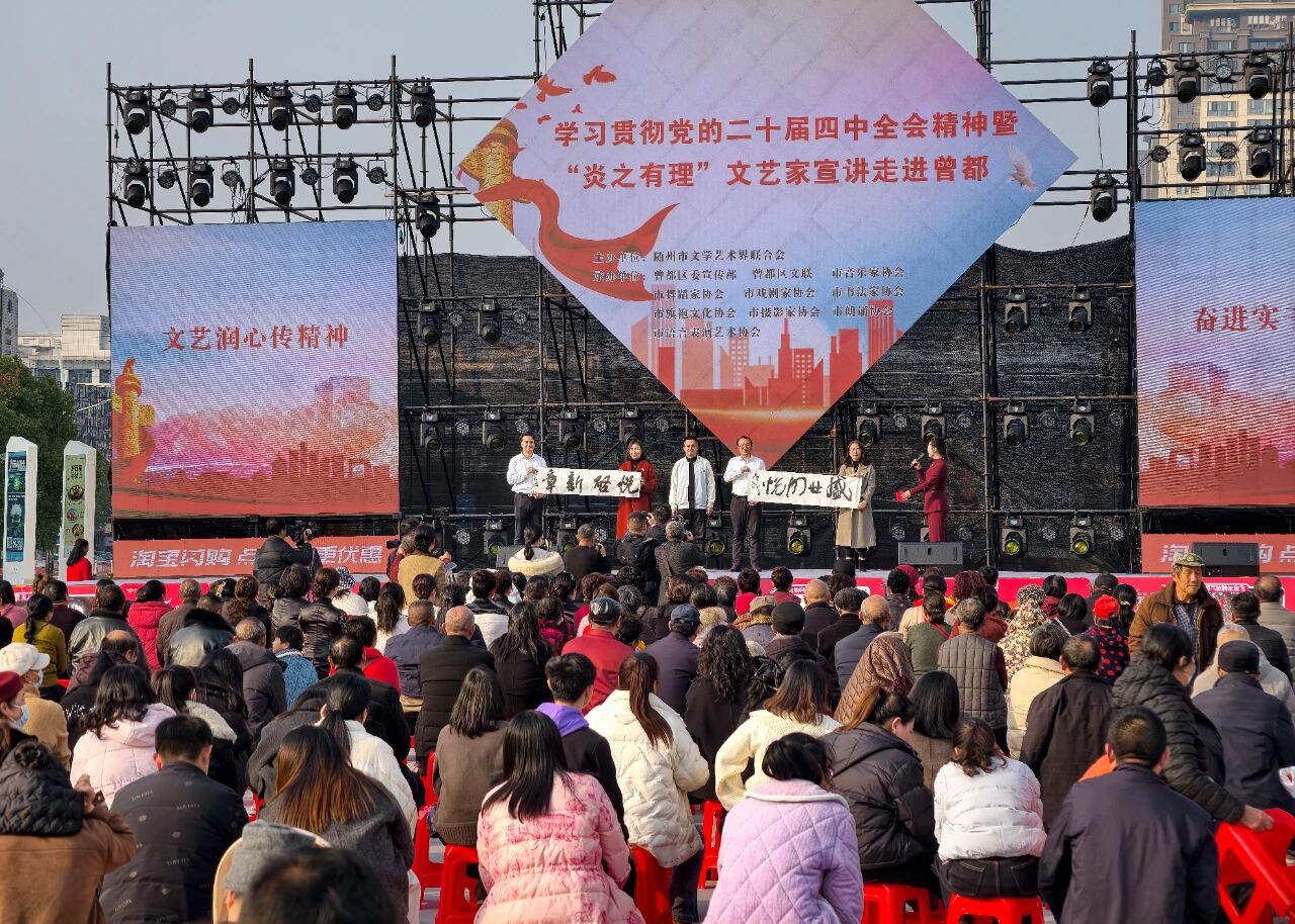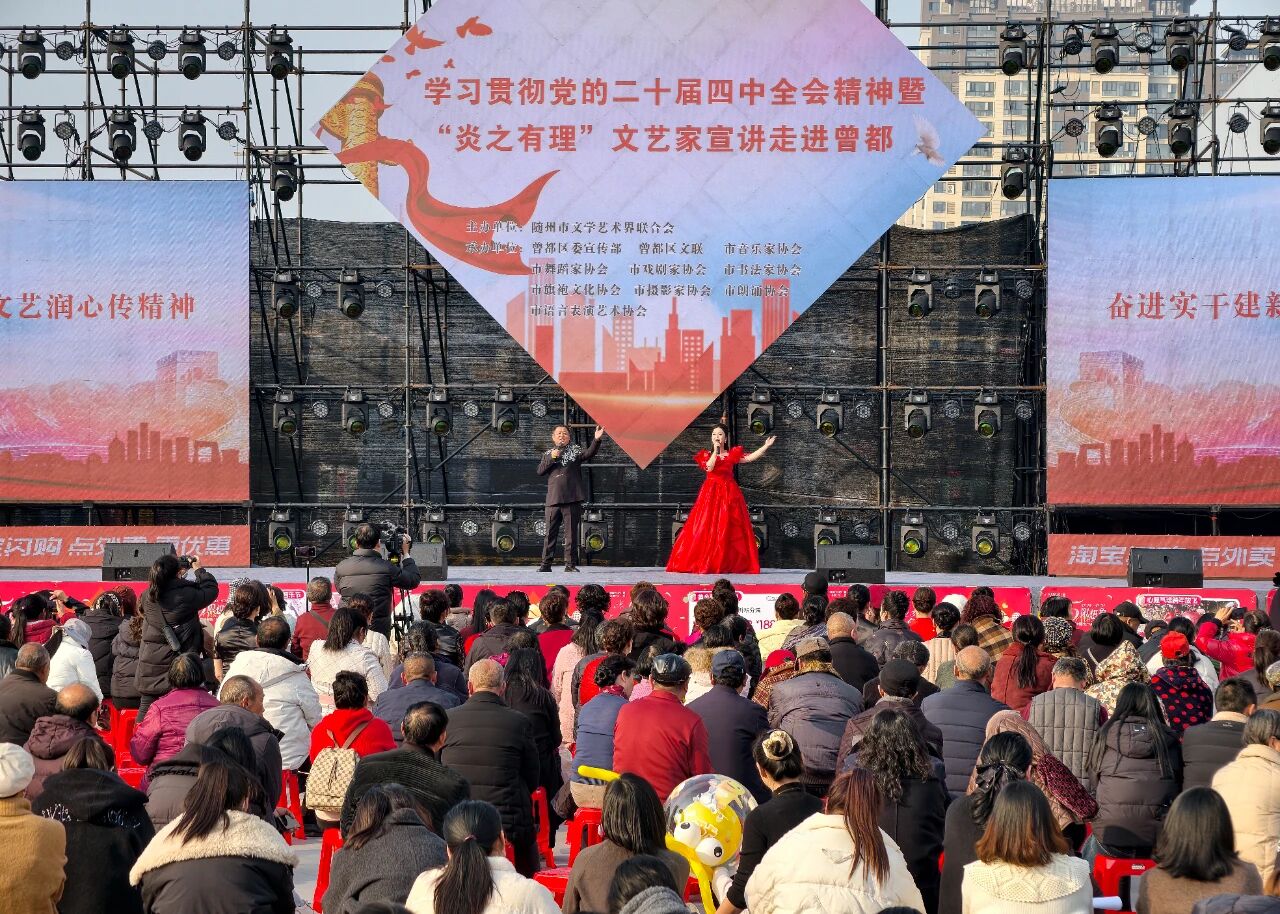 冬日午后,阳光和煦。12月19日下午,曾都区吾悦广场人头攒动,舞台背景板上“学习贯彻党的二十届四中全会精神”的标语在阳光下熠熠生辉,一场集理论性和艺术性于一体的特色宣讲活动,在这里拉开序幕。来自我市各文艺家协会的艺术家们,用旋律、舞姿、笔墨传递全会精神,用真情实感奏响时代强音。
