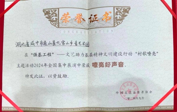 9月19日至21日,由中国文艺志愿者协会、中共内蒙古自治区委员会宣传部主办的“强基工程”——“村歌嘹亮”主题活动2024全国集中展演,在内蒙古鄂尔多斯举行。湖北省文联选送的通山县九宫山乡音艺术团在55支队伍中脱颖而出,凭借节目《通山小调联唱》以97.16分的高分取得第四名佳绩,获得“嘹亮好声音”表彰。