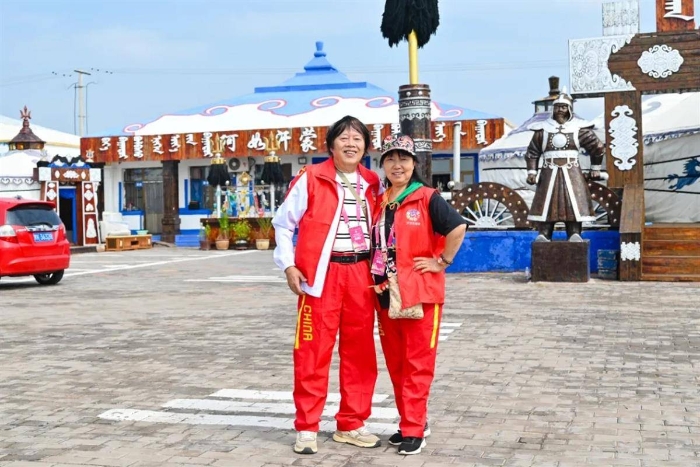 在去往演出场地伊金霍洛旗巴音昌呼格草原的路上,九宫山乡音艺术团的队员们早早穿上了简约古朴的山歌队服。