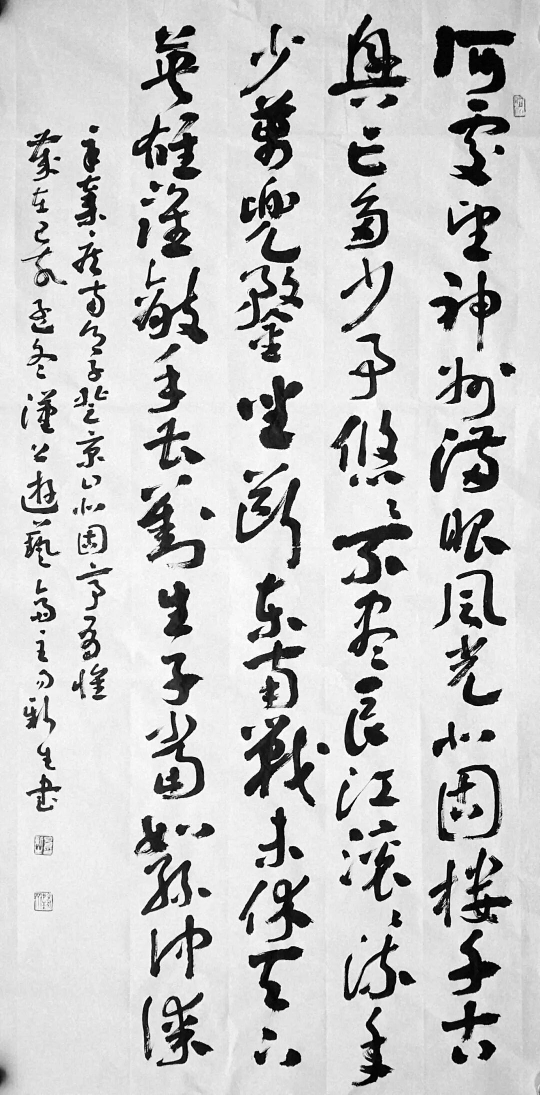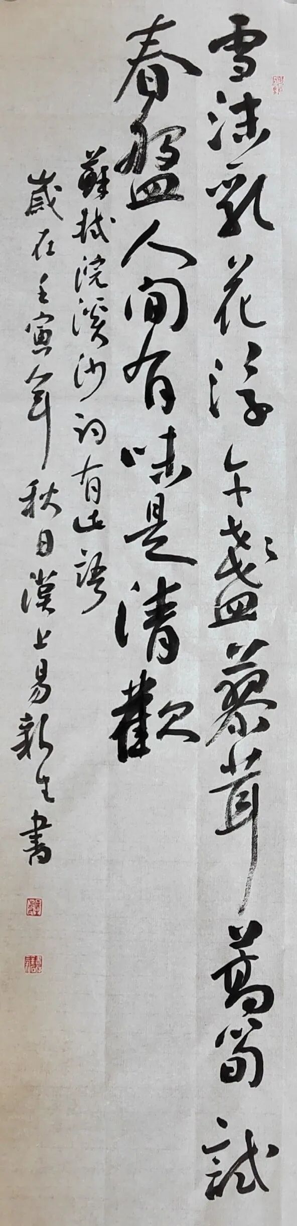 书画同源的体悟,是易新生艺术转型的关键。他在《书写的感觉》中分析:“绘画的疏密构图、虚实相生之理,与书法章法天然相通。”这种跨媒介的艺术敏感,使他在书法创作中始终注重整体布局——无论是条幅的纵势还是横披的横势,无论是单字的结体还是全局的呼应,都能看到绘画思维对其的深刻影响。但真正让他实现突破的是“以文养墨”的实践:为深研书艺,他系统阅读古代书论并撰写文章,在梳理书学脉络的过程中,意外打通了文脉与墨韵的内在关联。