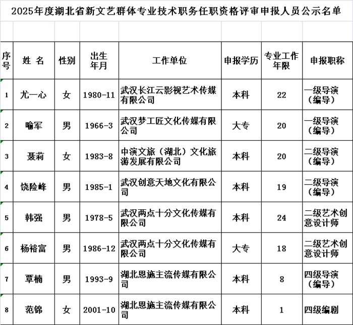 附件:2025年度湖北省新文艺群体专业技术职务任职资格评审申报人员公示名单