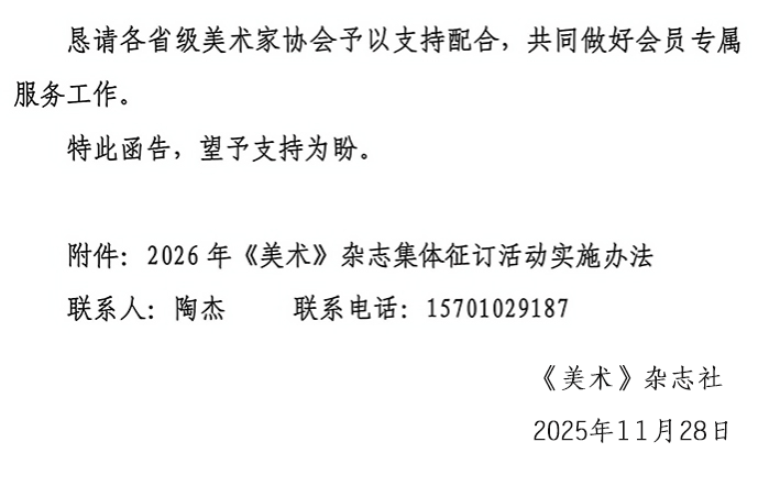 请各单位收到本通知后,认真阅研《关于联合开展中国美术家协会、各省美术家协会会员专属服务的函》及《2026年〈美术〉杂志集体征订活动实施办法》。请结合本通知要求,做好宣传和组织工作。