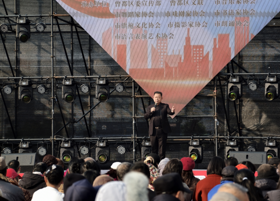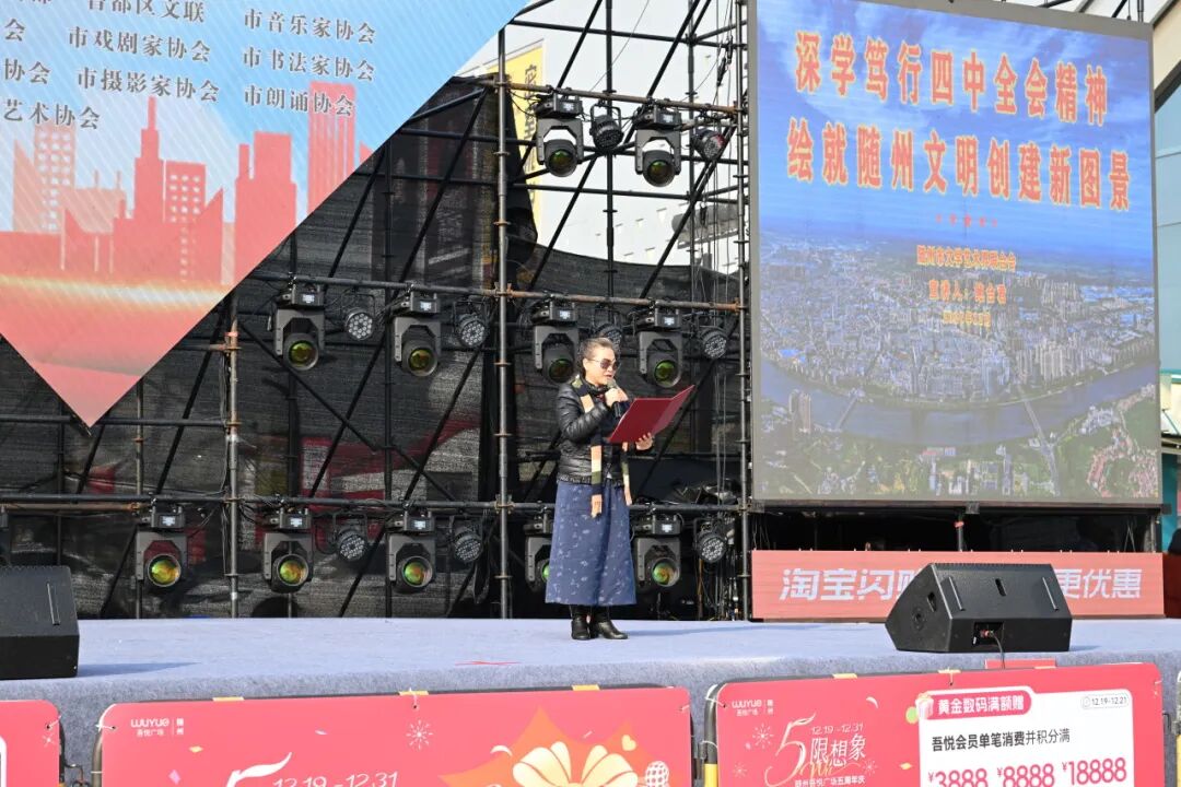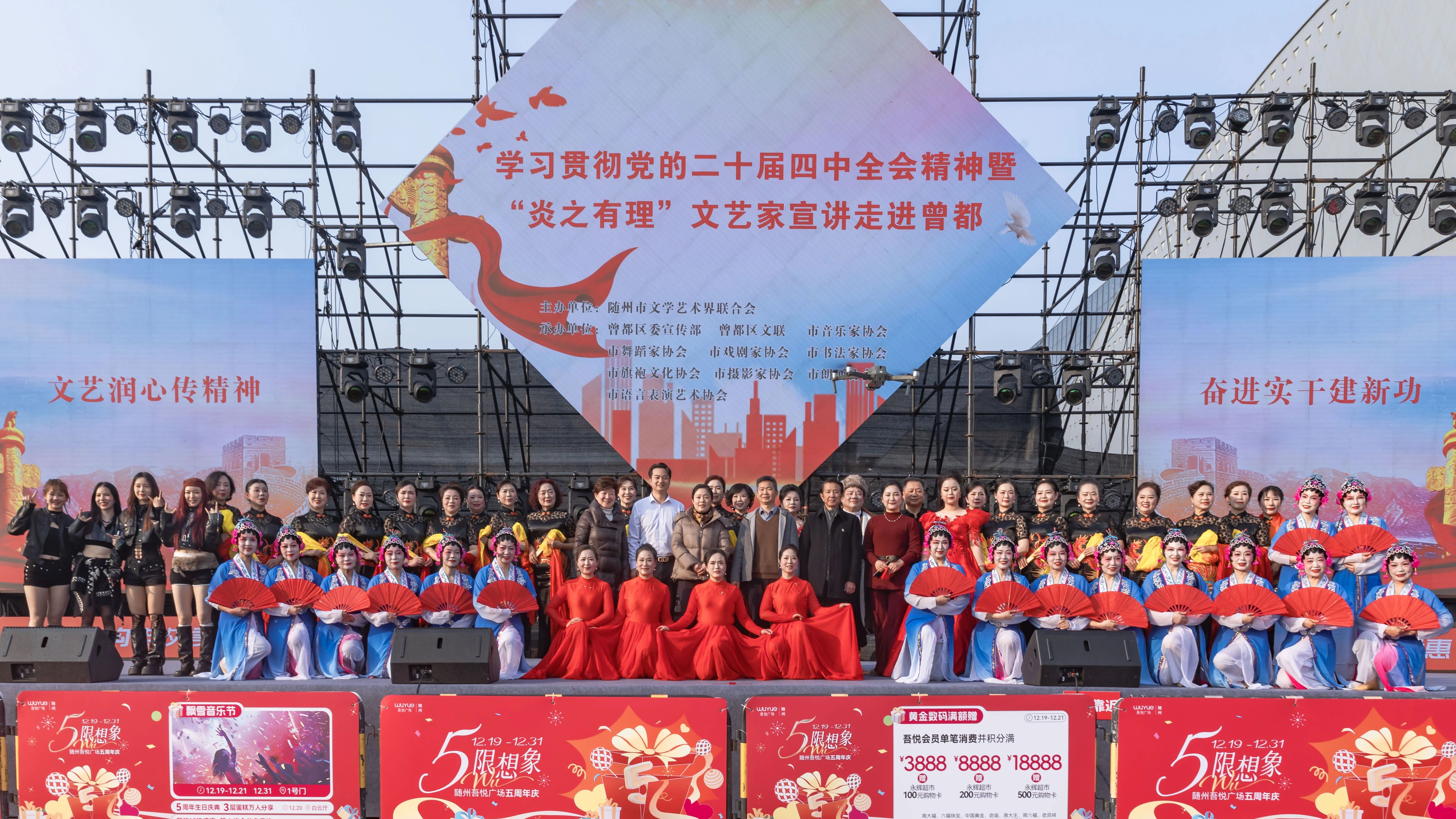 冬日午后,阳光和煦。12月19日下午,曾都区吾悦广场人头攒动,舞台背景板上“学习贯彻党的二十届四中全会精神”的标语在阳光下熠熠生辉,一场集理论性和艺术性于一体的特色宣讲活动,在这里拉开序幕。来自我市各文艺家协会的艺术家们,用旋律、舞姿、笔墨传递全会精神,用真情实感奏响时代强音。