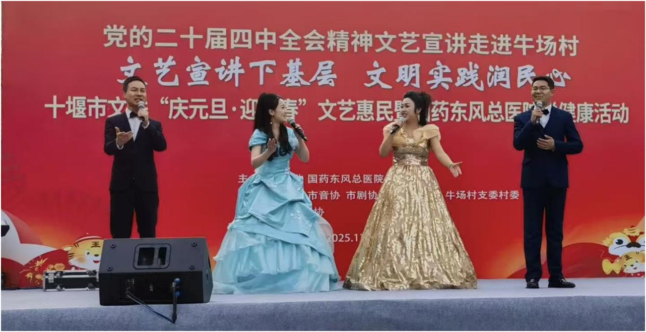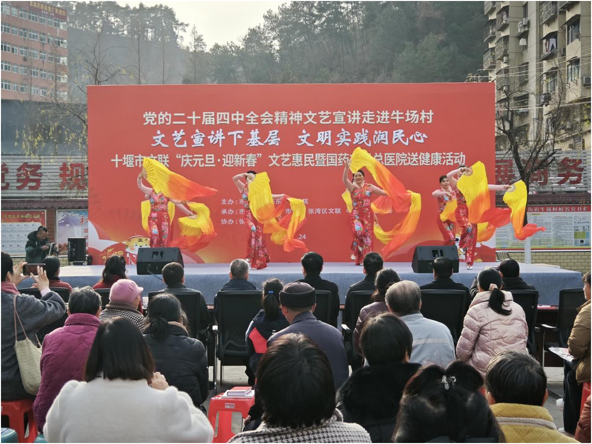 冬阳送暖,年味渐浓。12月24日下午,十堰市张湾区红卫街办牛场村热闹非凡,“党的二十届四中全会精神文艺宣讲暨‘庆元旦・迎新春’文艺惠民送健康活动” 在此举行。活动以“文艺+宣讲+服务”的创新形式,将党的政策暖流、文化盛宴与健康关怀送到基层末梢,让二十届四中全会精神在乡村落地生根。