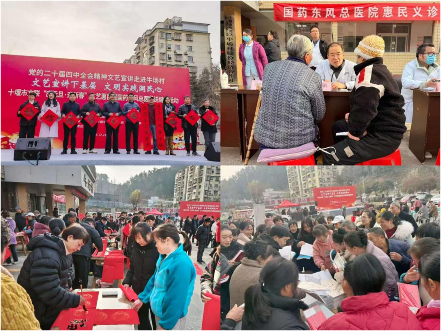 惠民服务同步升温,成为活动暖心底色。十堰市文联全体干部职工为村民们送上书籍,十堰市国药东风总医院专家团队现场开展义诊,骨科专家韩珩现场教授颈肩腰腿痛保健操。十堰市书协、十堰市美协的书画家们挥毫泼墨,将百余幅饱含新春祝福的春联和“福”字送到村民手中,墨香里满是温情。
