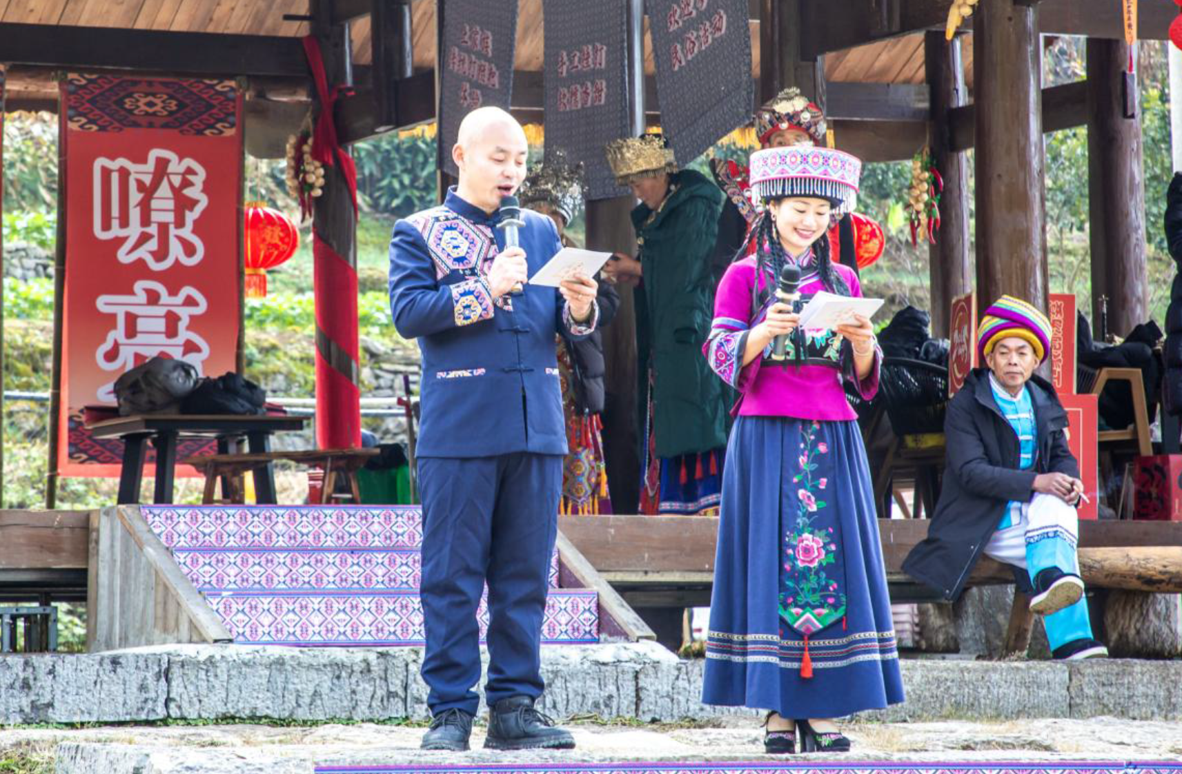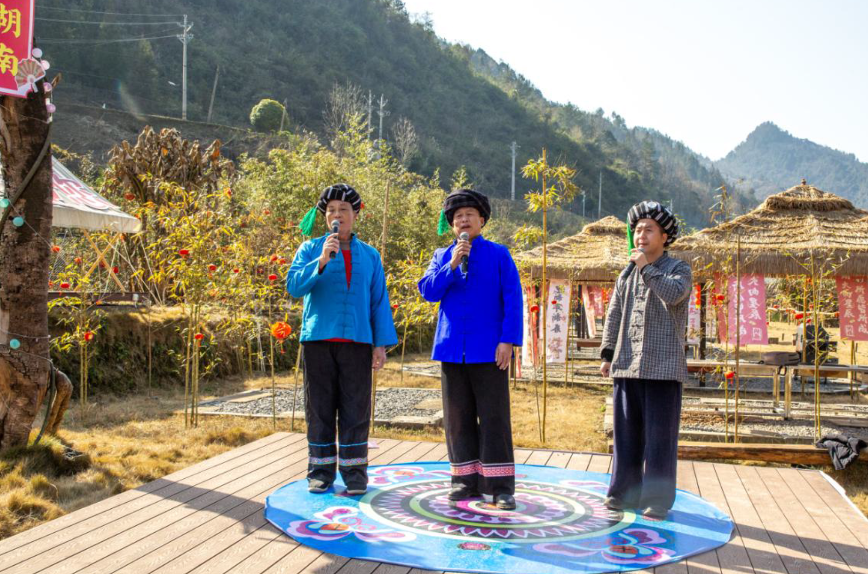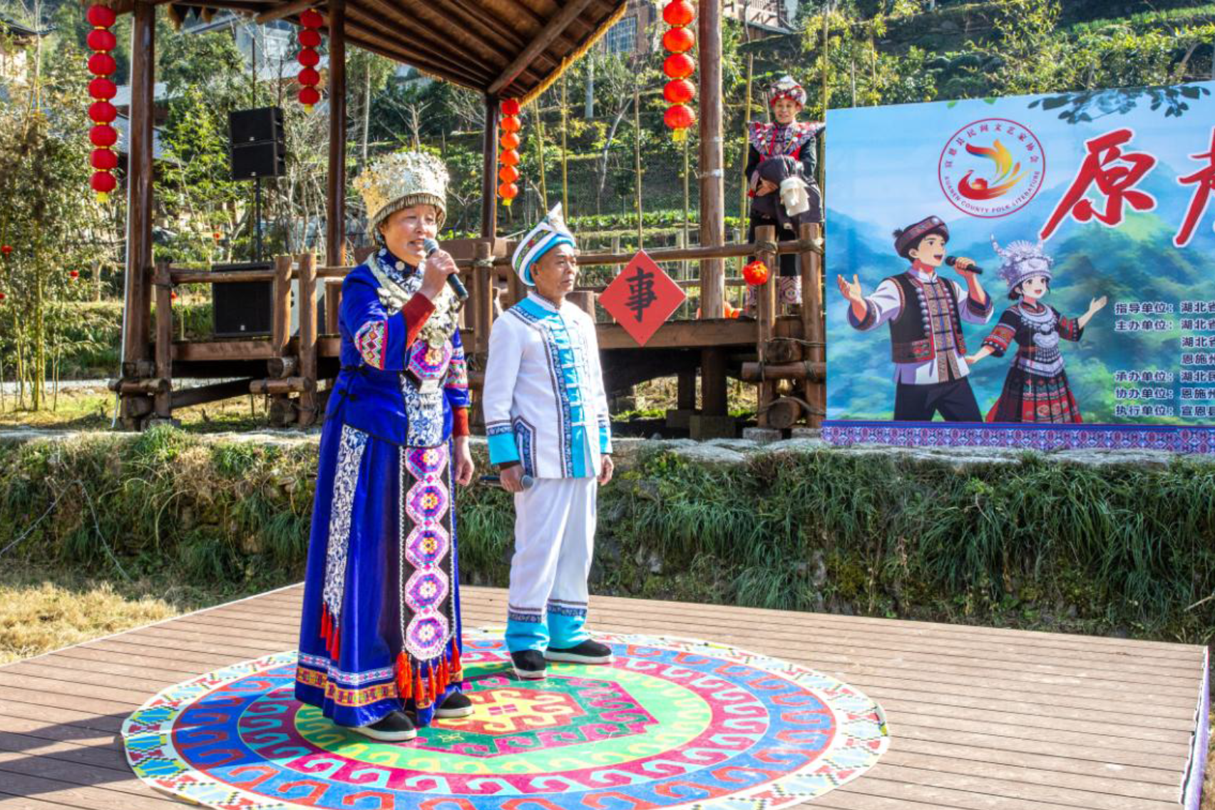 为了充分展示各地民歌特色,让四省的山民歌文化更好地交融碰撞,现场利用了彭家寨特有的地理位置,按照民歌特点安排了七个表演位。演出由利川灯歌恩施州级代表性传承人谭琴琴、国家级非遗项目《薅草锣鼓》恩施州级代表性传承人李万珩主持。