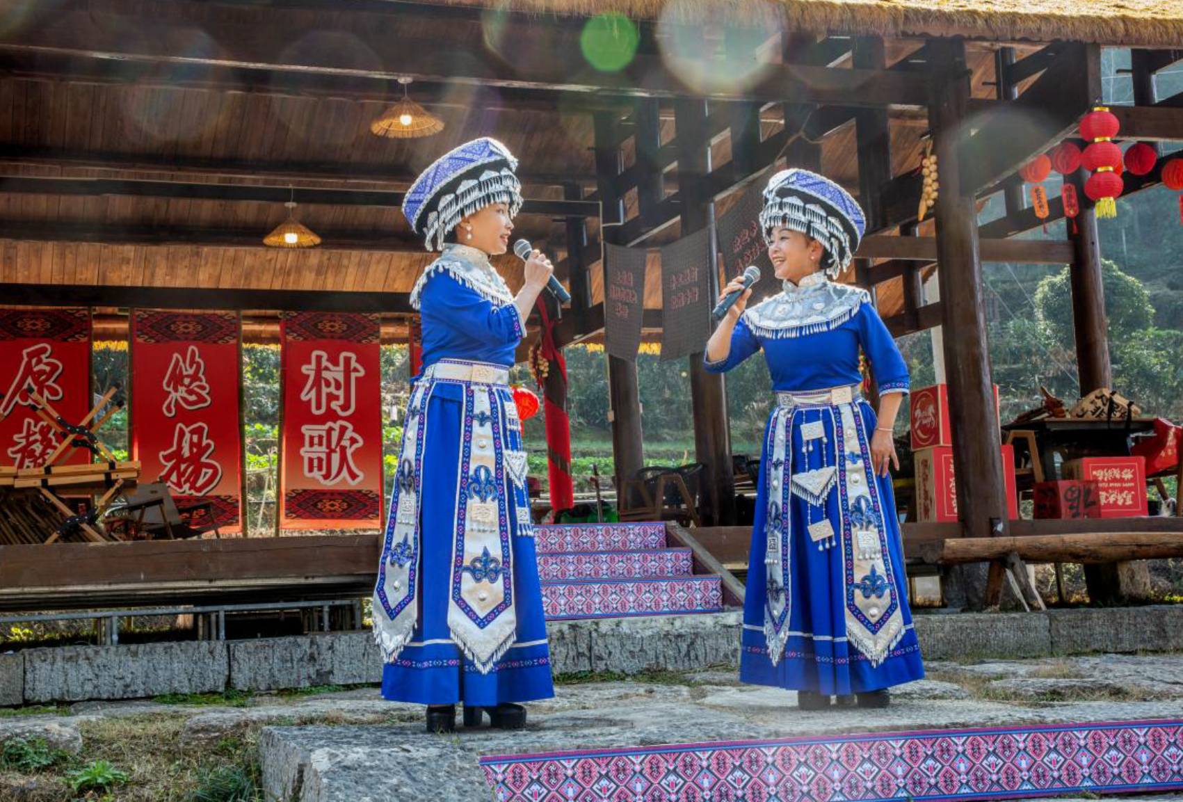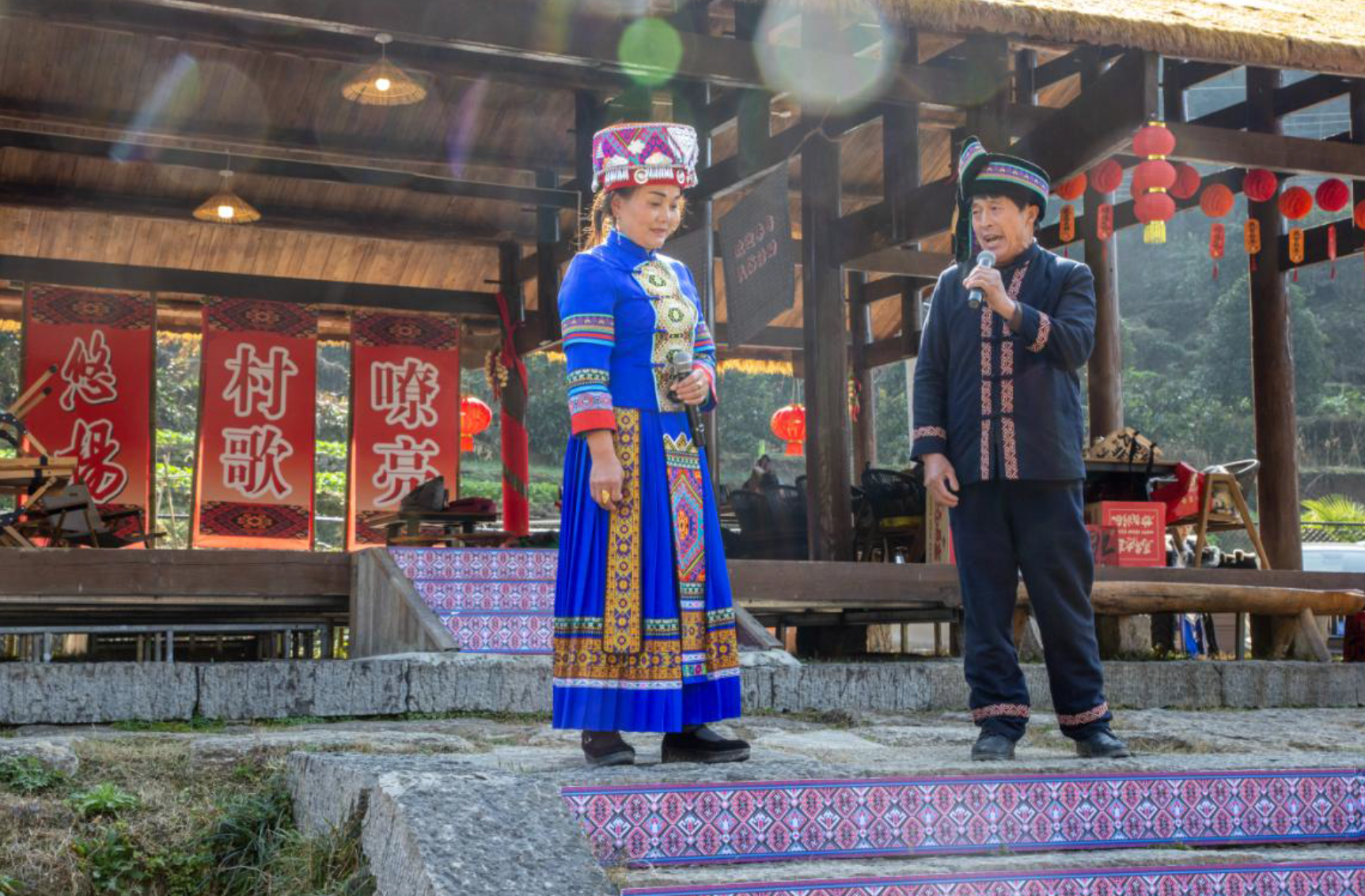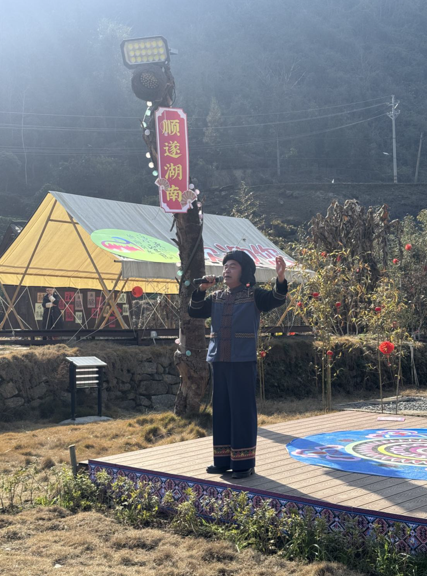 为了充分展示各地民歌特色,让四省的山民歌文化更好地交融碰撞,现场利用了彭家寨特有的地理位置,按照民歌特点安排了七个表演位。演出由利川灯歌恩施州级代表性传承人谭琴琴、国家级非遗项目《薅草锣鼓》恩施州级代表性传承人李万珩主持。