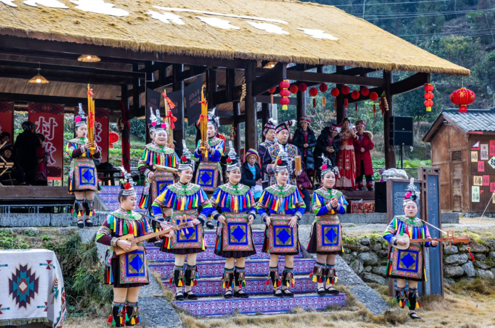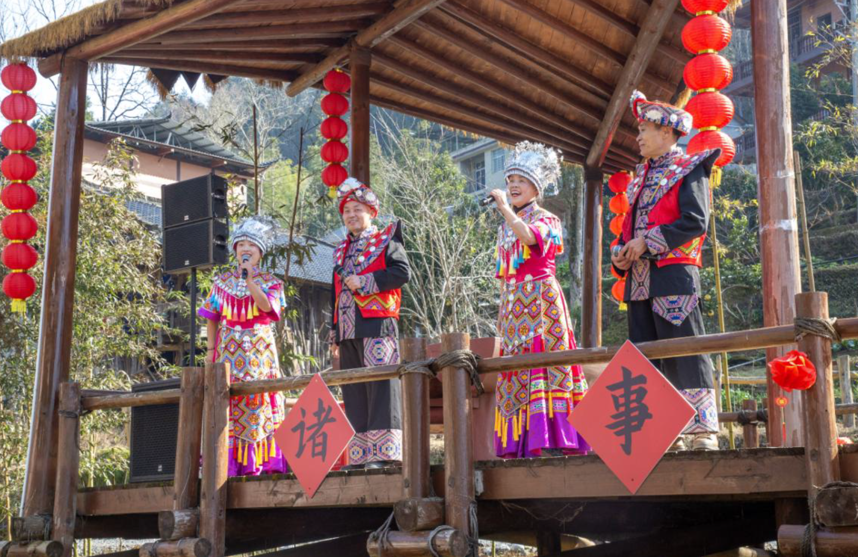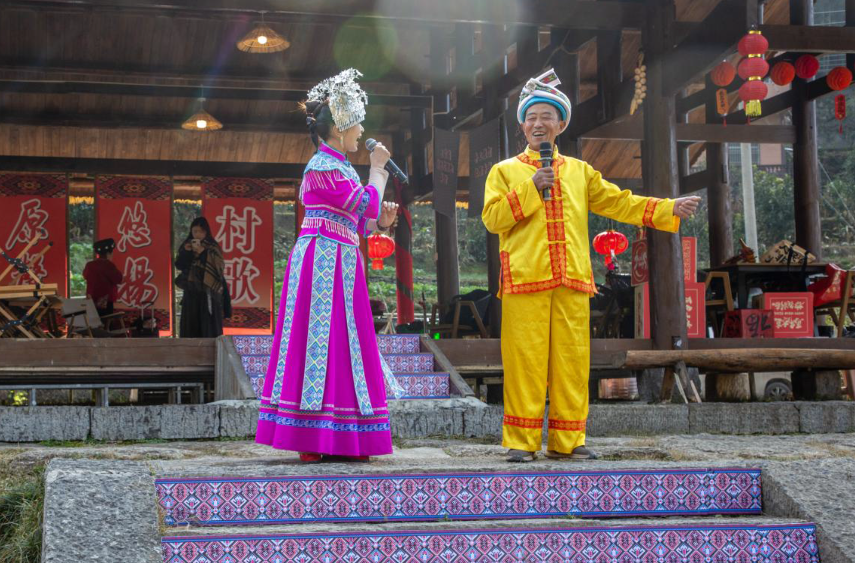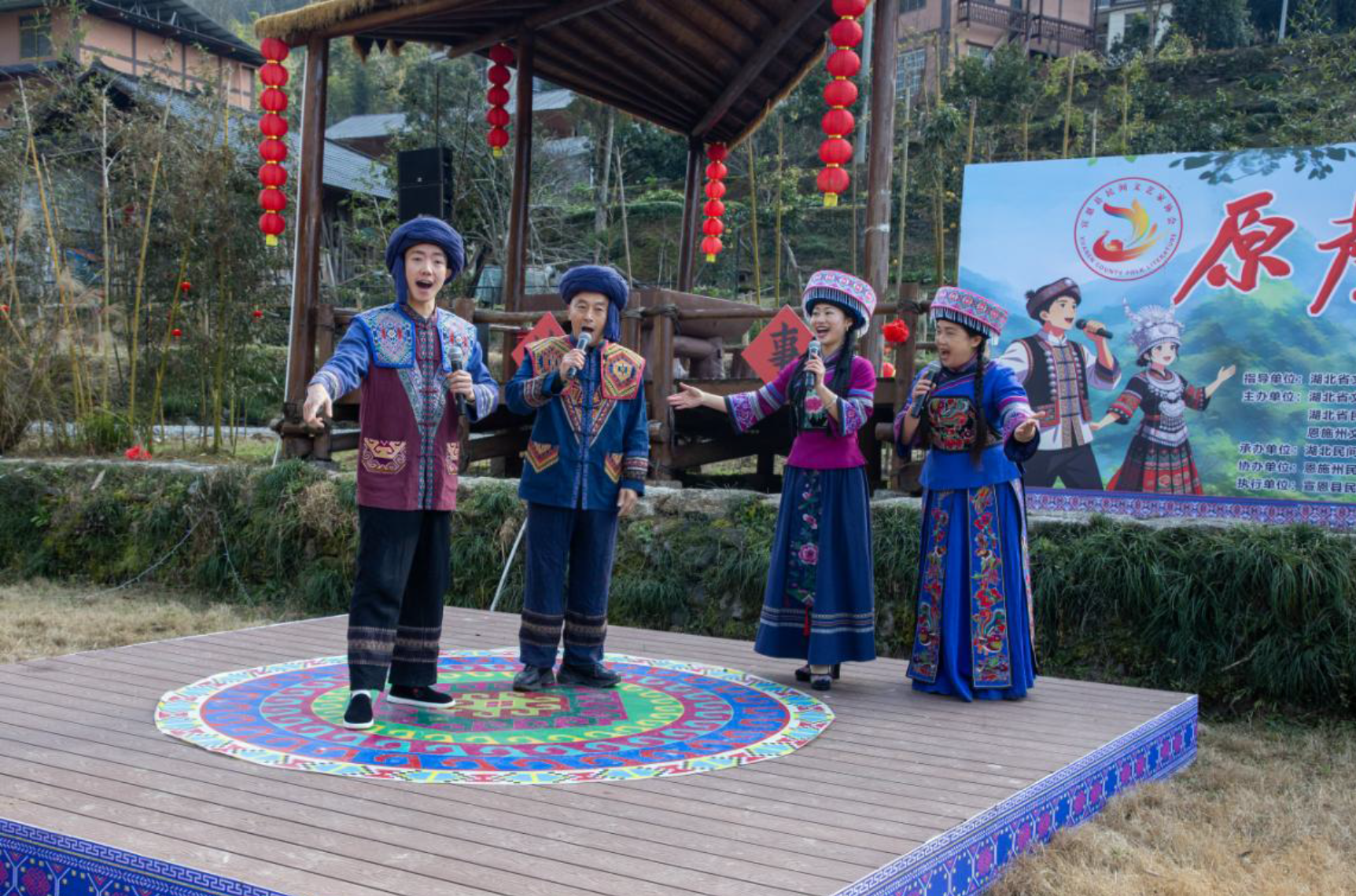 2月2日上午,宣恩彭家寨锣鼓喧天,热闹非凡,“原声悠扬,村歌嘹亮”——湘鄂渝黔四省原声民歌展演在这里盛大举办。来自湖南、湖北、重庆、贵州四省的民歌手代表将武陵山区传唱千年的原声民歌在这里唱响。省文联党组成员、副主席马尚云,中南民族大学原党委常委、副校长、教授段超,省民协主席鄢维新,中共宣恩县委副书记、宣传部长陈久奎,恩施州文联专职副主席张情,省民协秘书长黄超芬,省内有关民歌专家在现场观看了演出。