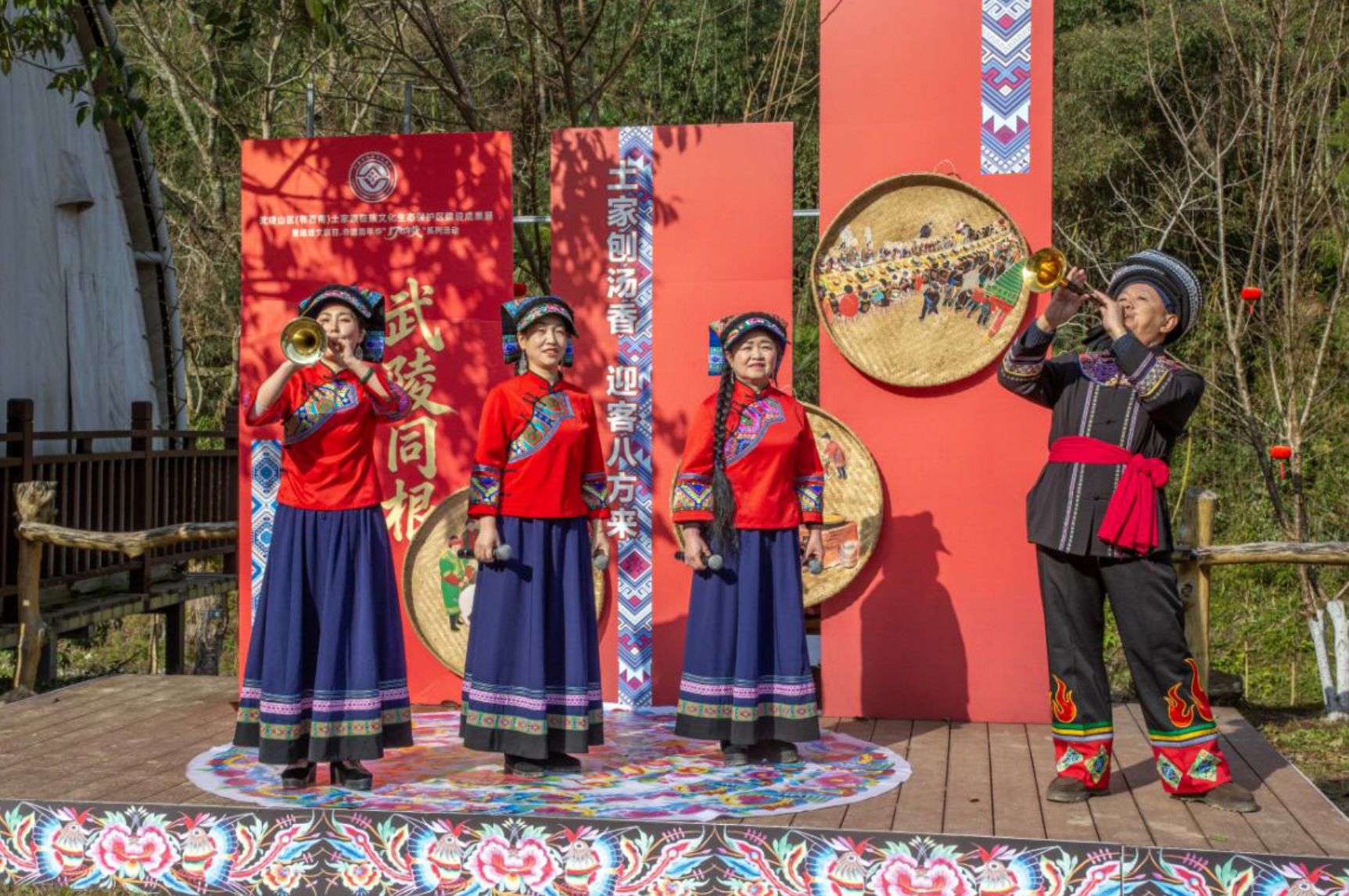 第三篇章“乡心永续•奋进创新”中,木叶山歌湖南龙山县级代表性传承人彭茂森、土家山歌湖南龙山县级代表性传承人田永国、付玉英以及土家语传承人田秀珍带来的龙山民歌串烧《格酷扎》《土家情歌对唱》、湖北鹤峰穿句子山歌恩施州级非遗传承人邓芝兰和邓盛兰带来的《摘朵栀子花》接连上场。贵州省黎平县铮铮琴韵民歌队带来的侗族“君琵琶”《铮铮琴韵不忘党恩情》,让大家感受到侗族“君琵琶”的独特魅力。杨金辉、吴凤国和龙求表带来的苗歌《美丽凤凰我的家》,采用湖南湘西原生态苗族民歌凤凰山江八固腔,为大家展开神秘湘西天下凤凰美丽画卷。恩施太阳河民歌湖北省级代表性传承人谢小平和恩施市级代表性传承人周为寿带来了恩施民歌《疙瘩歌》。诺西十姊妹歌艺术团带来了诺西婚俗文化中极具代表的土家《十姊妹歌》,让人觉得既感动又喜庆。展演在四省民族地区演员与观众合跳土家摆手舞中落下帷幕。