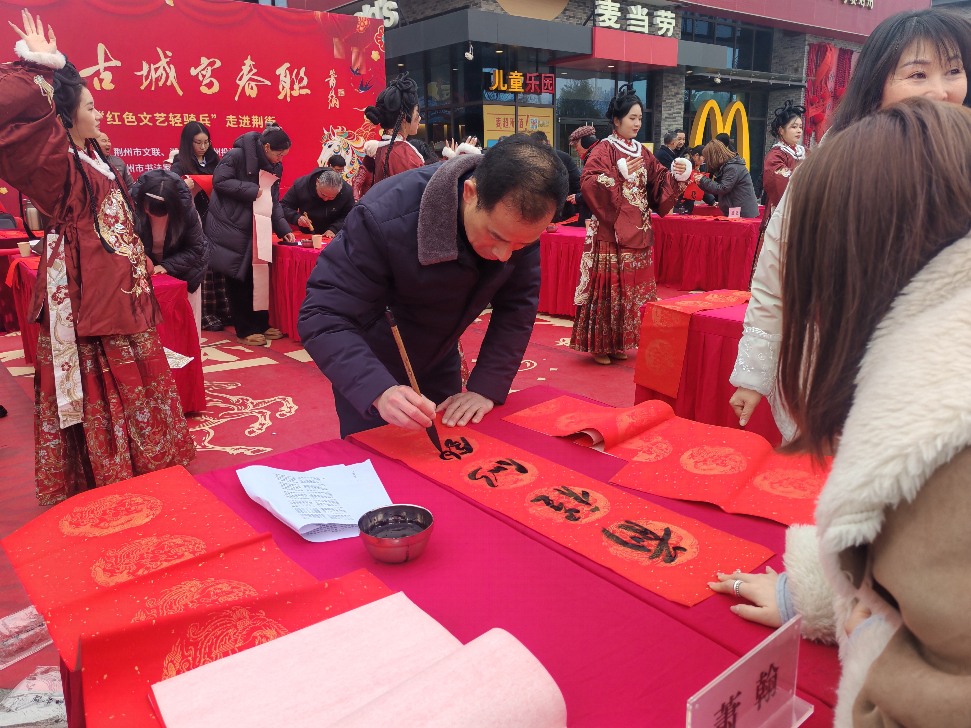 与此同时,“我为古城写春联”活动在荆街南广场同步举行。书法家们现场挥毫泼墨,将一副副满载祝福的春联和“福”字赠予市民游客,传递温暖诚挚的新年祝愿。