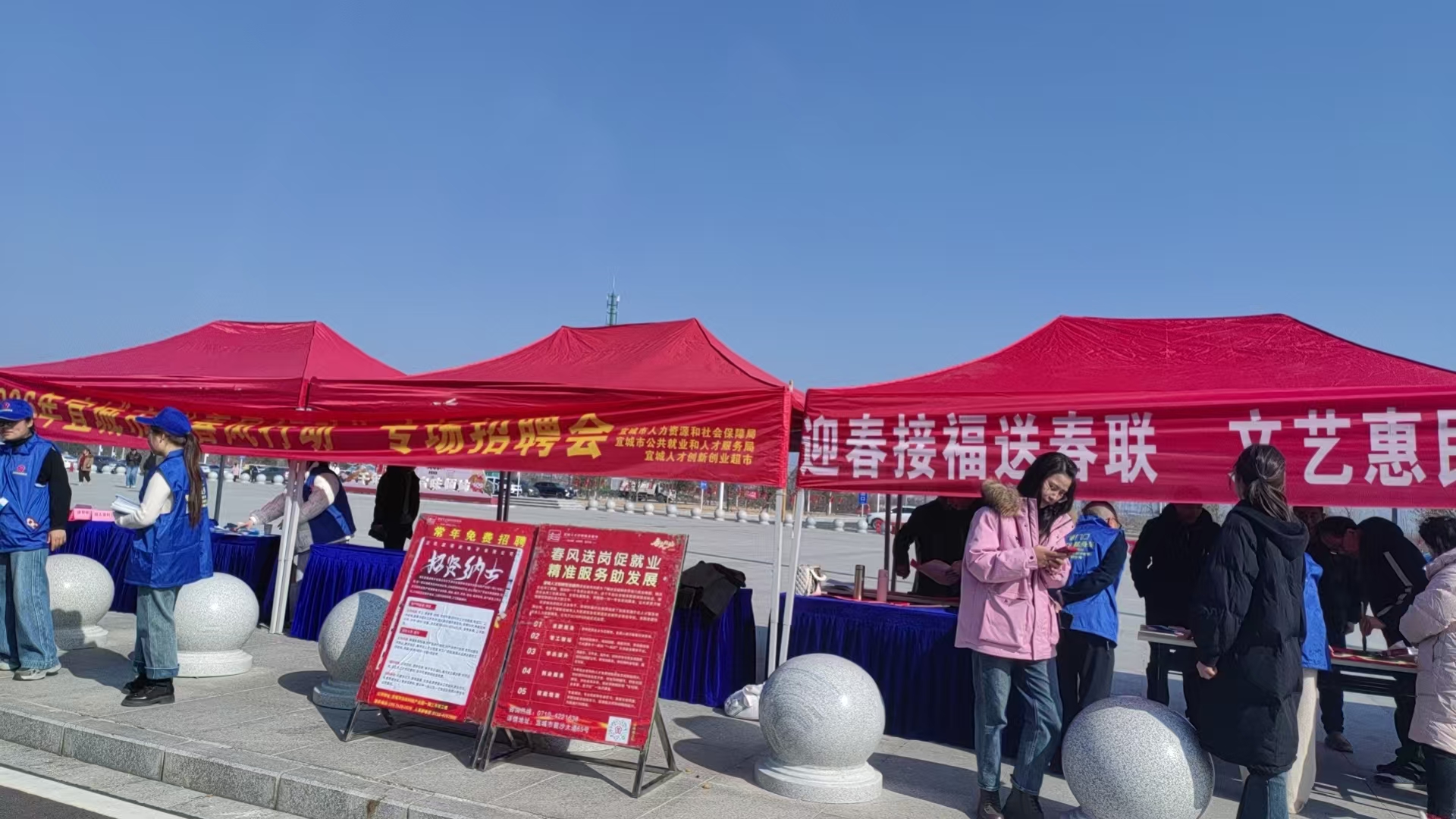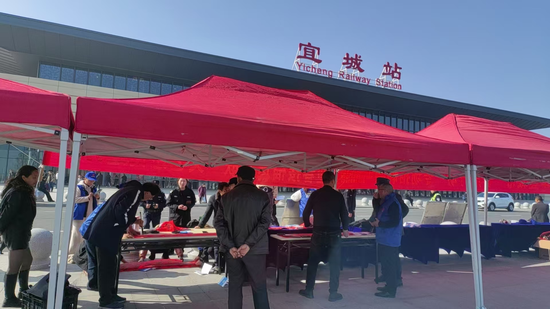 2月15 日,宜城市文联联合人社部门在宜城高铁站开展“返乡有暖 服务随行”活动。宜城市文联组织8 位书法家协会老师现场挥毫泼墨,为往来旅客送上满载祝福的春联。