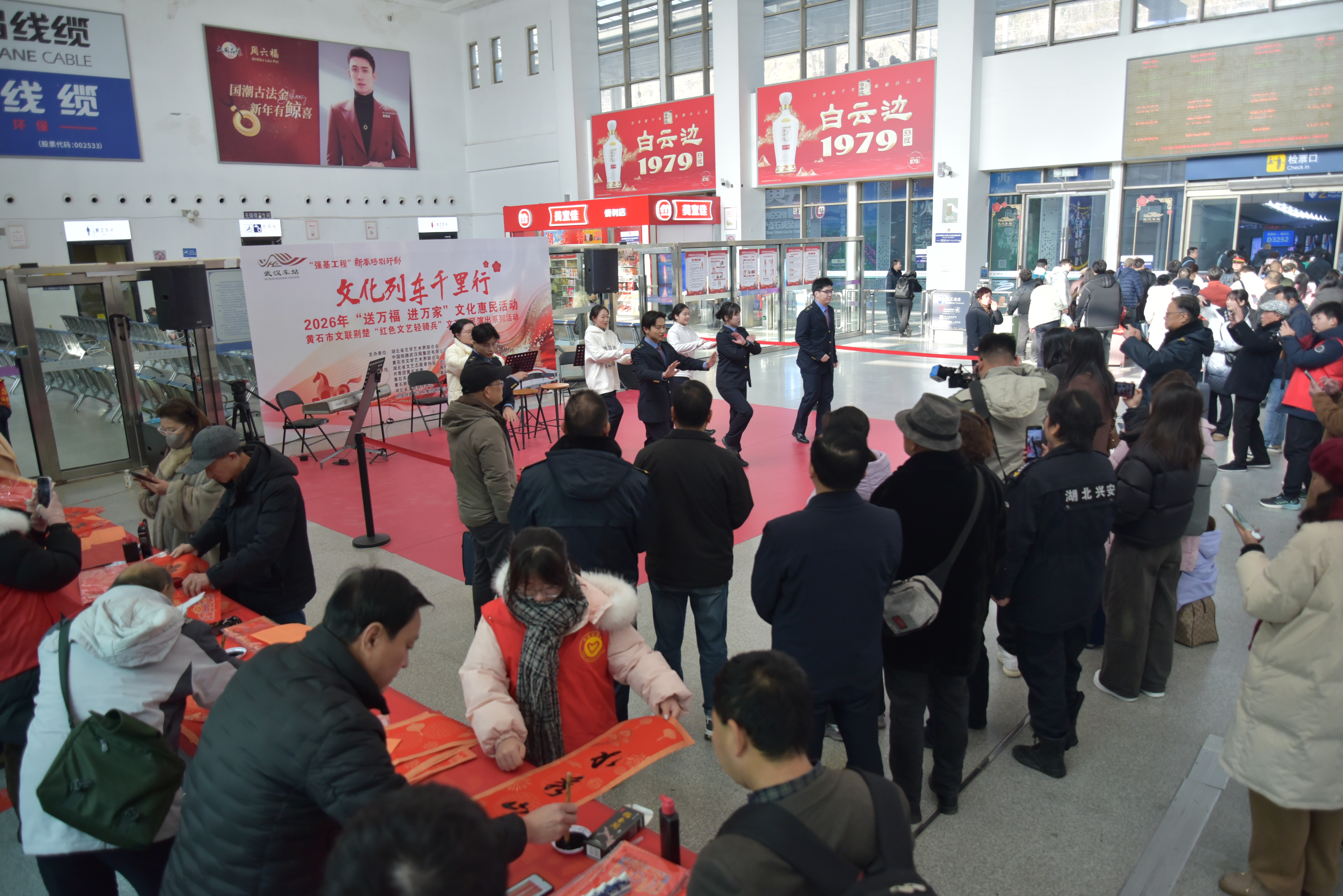 2月2日,春运首日,黄石北站候车大厅内人潮涌动。湖北省文联、中国铁路武汉局集团有限公司、市文联联合主办的“文化列车千里行·送万福进万家”活动在此举行。大厅一侧,长桌被围得水泄不通,红纸铺展,笔墨飘香,书法家为过往旅客定制春联。蕴含欢乐喜庆、寄托新春祝福的对联一一呈现,旅客们手拿墨迹未干的春联与书法家合影留念,将这份独特的“文化年货”带上旅途。