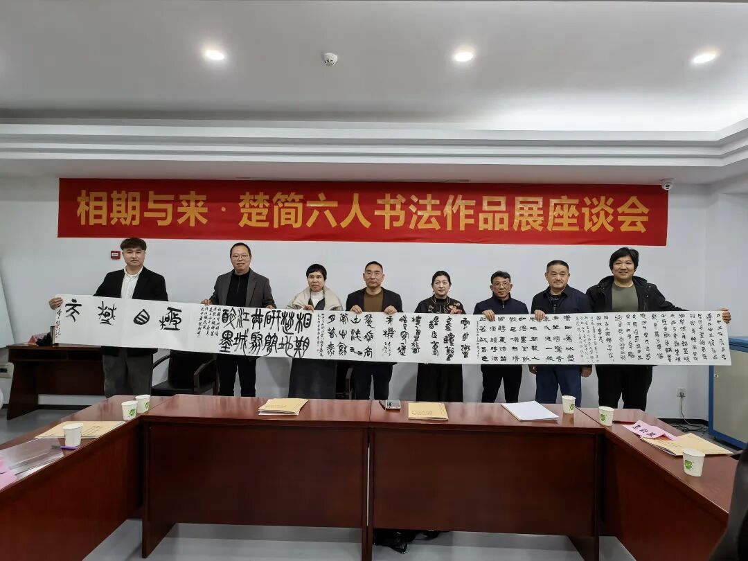 上午10时,在湖北省书法院召开了“相期与来·楚简六人书法展座谈会”。中国书协行书委员会委员、湖北省书协副主席、湖北省书法院副院长樊利杰,湖北省书法院楚简书法研究中心副主任、湖北中流印社顾问何慧敏,一级美术师、独立艺术家马春钢,湖北省书法院楚简书法研究中心研究员、两届楚简书法骨干高研班成员,参展作者谢辉旺、曾文轩、孟艳丽、聂政、刘彦武、杨欢,书法报记者印兆麒等参加座谈会,湖北省书法院楚简书法研究中心秘书长严国珍主持座谈会。与会嘉宾围绕楚简书法的传承与创新展开交流,畅谈荆楚文脉的当代延续。