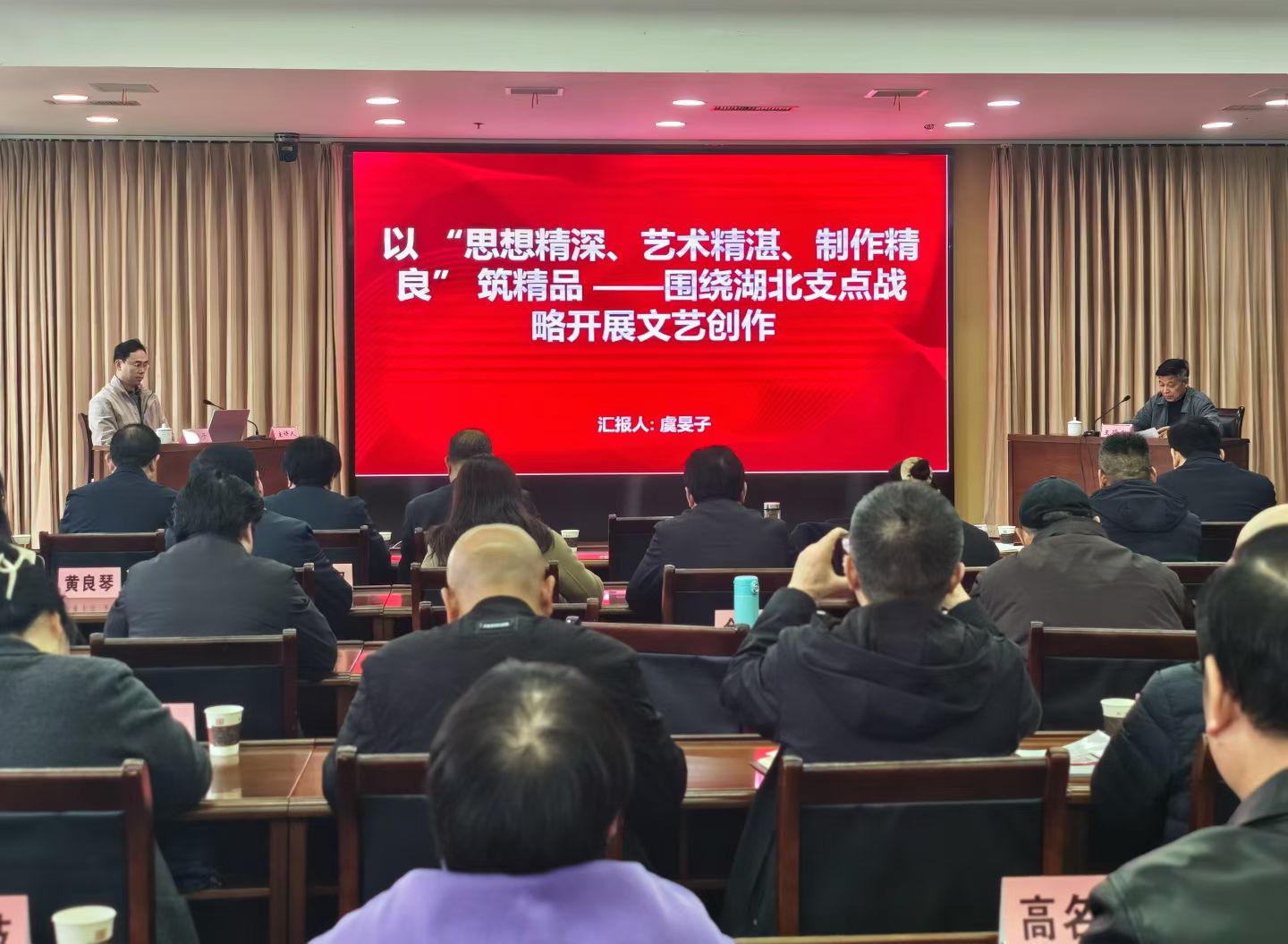 全委会结束后,虞旻子作了题为《以 “思想精深、艺术精湛、制作精良” 筑精品 ——围绕湖北支点战略开展文艺创作》的专题授课。他从思想精深:立根铸魂,让作品扎紧湖北时代土壤;艺术精湛:打磨筋骨,让作品彰显荆楚艺术魅力;制作精良:雕琢血肉,让作品匹配精品创作标准;融会贯通:将“三精”要求贯穿创作全流程,打造本土精品;国家层面重点扶持项目;湖北省级重点扶持项目;申报通用注意事项等7个方面进行了深入浅出的解读。他立足湖北加快建成中部地区崛起重要战略支点,全面阐释了全省文艺发展现状,就打造荆楚文艺精品提出了针对性的对策与思考,强调要将“三精”要求贯穿创作全流程,聚力打造本土标杆力作。同时,虞院长还详细解读了国家级、省级重点文艺扶持项目申报要点,为高效精准申报厘清了路径、提供了方法。