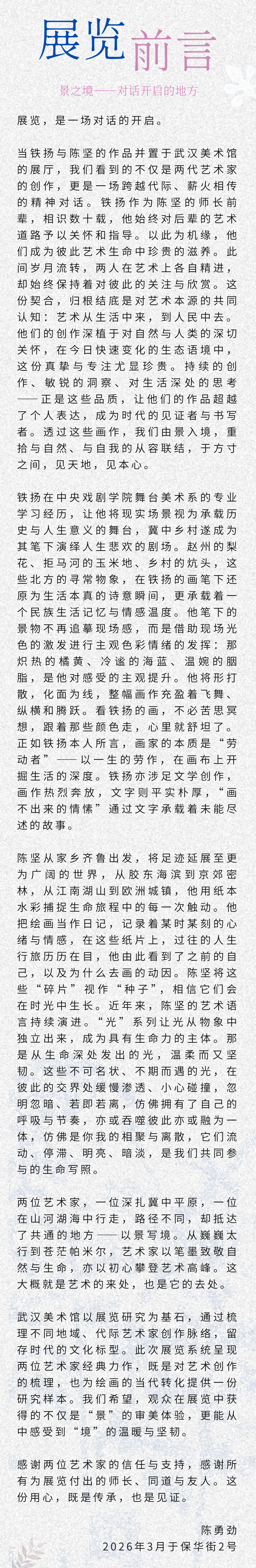 3月27日,“景之境——铁扬、陈坚作品展”在武汉美术馆(汉口馆)开展。展览共展出铁扬、陈坚两位艺术家不同时期的作品、手稿等300余件。
