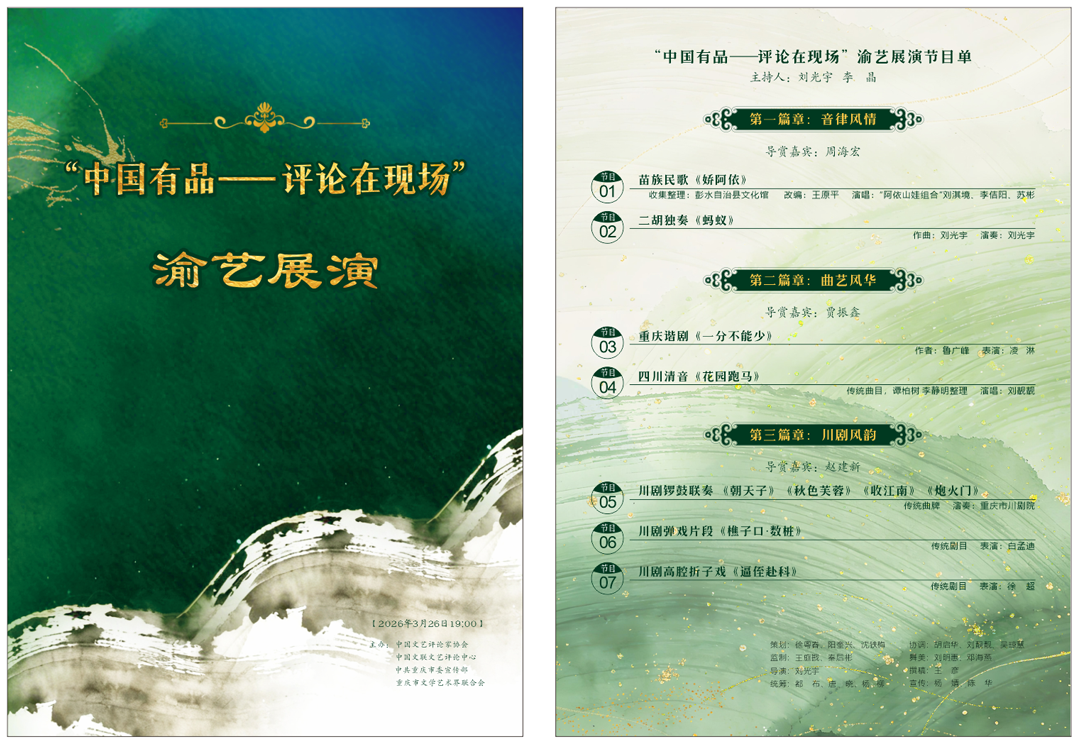 26日晚上,举行了“中国有品——评论在现场”渝艺展演。展演分“音律风情”“曲艺风华”“川剧神韵”三个篇章,演绎巴渝文化,展现山城魅力。展演突出演评结合,由周海宏,贾振鑫,中国评协理事、中国戏曲学院教授赵建新作文艺品评导赏,以切实提升文艺评论价值引导、精神引领、审美启迪作用。