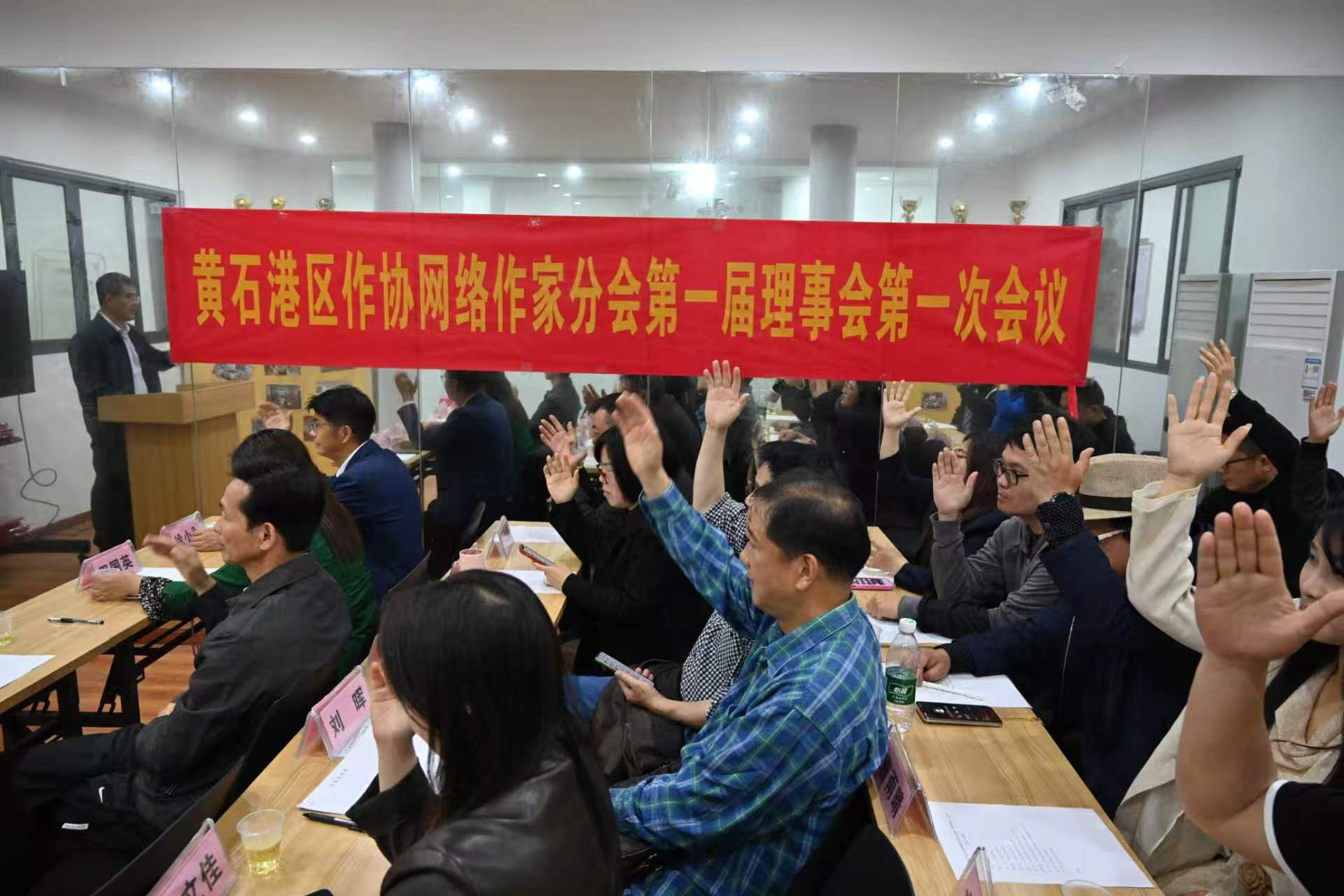 会议选举产生了黄石港区作家协会网络作家分会领导机构,徐小平当选主席,徐志明、周国英、吕山东等聘为名誉主席,王路成、陈华贵、李威、程青当选副主席,周文佳当选秘书长,方青龙、曹雨晴当选副秘书长,袁德胜、刘爱华、周钰华、汪超超等26人在此前召开的代表会议上当选理事。