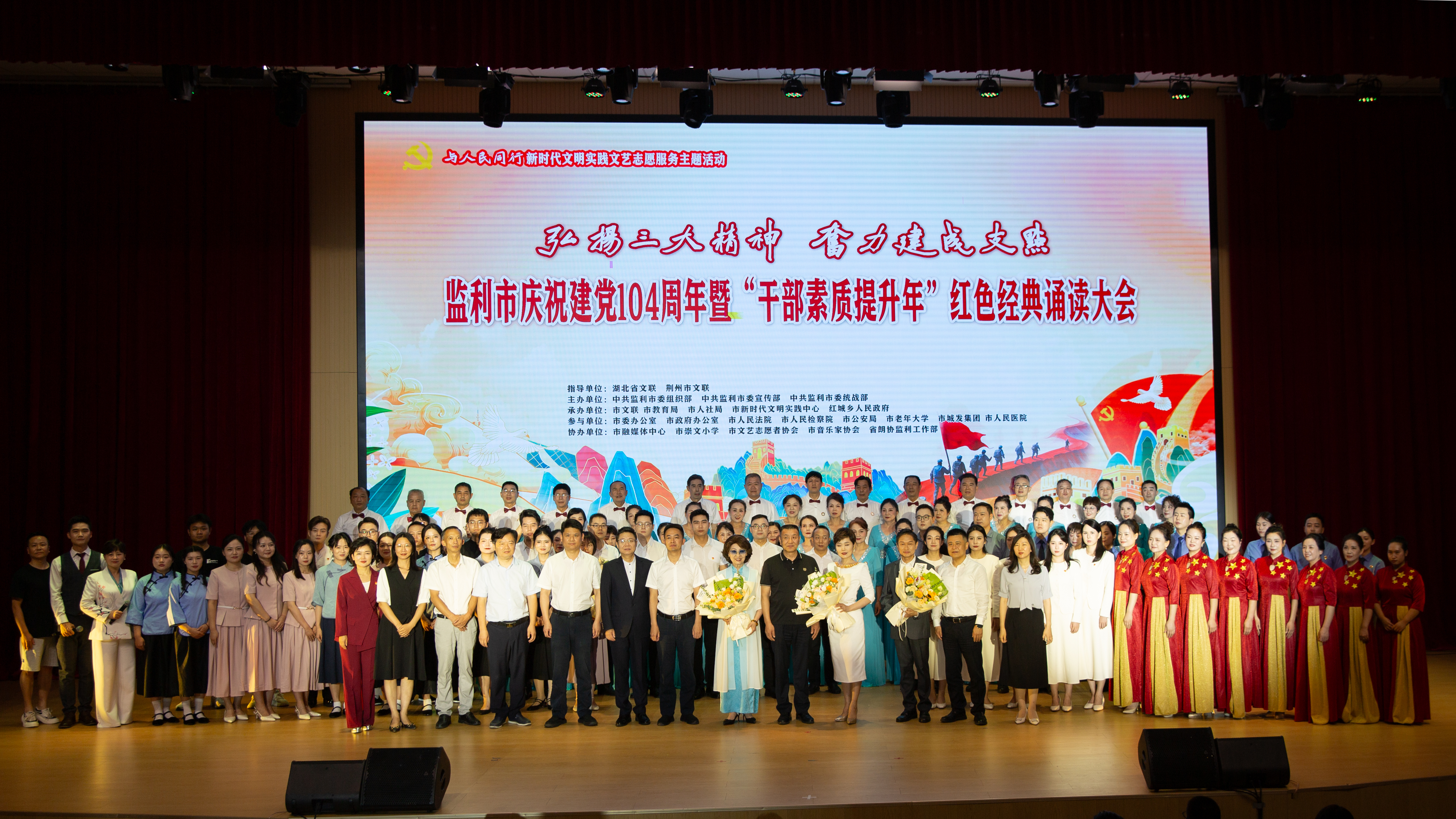 一是借东风,办好省级大活动。我们积极向上对接。在省文联、省音协的大力支持下,“村村有歌·唱响湖北——暨‘古镇七彩烂漫游’田园歌会”在中国历史名镇程集盛大举行,《故乡是监利》《监利酒 天下友》等一批地方歌曲也同时展出,通过20余家主流媒体直播,全网在线观看量突破1700万人次。6月,我们举办了“弘扬三大精神 奋力建成支点”庆祝建党104周年红色诵读大会,特邀央视“金话筒”奖获得者张悦老师和省朗诵艺术家协会专家倾情演绎,700余名干部群众现场接受精神洗礼,以红色文化凝聚奋进力量。
