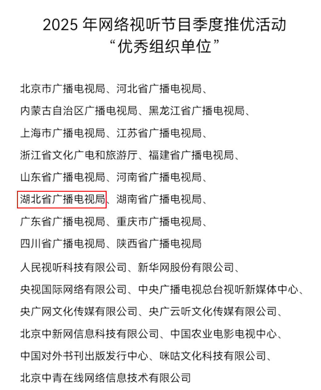 同时,为鼓励各省级广播电视局、中央直属单位在季度推优工作中发挥的积极作用,对北京市广播电视局、人民视听科技有限公司等27家优秀组织单位予以表扬。