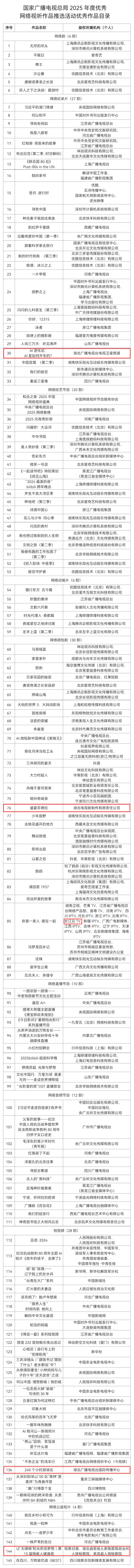 为深入学习贯彻习近平文化思想,贯彻落实全国宣传部长会议精神和全国广播电视工作会议精神,鼓励网络视听行业创作生产高质量视听内容,充分发挥优秀网络视听作品的示范引领作用,繁荣互联网条件下的新大众文艺,营造良好创作传播生态,国家广播电视总局在2025年季度优秀网络视听作品推选活动的基础上,开展年度优秀网络视听作品推选活动评审工作,最终确定145部入选作品。