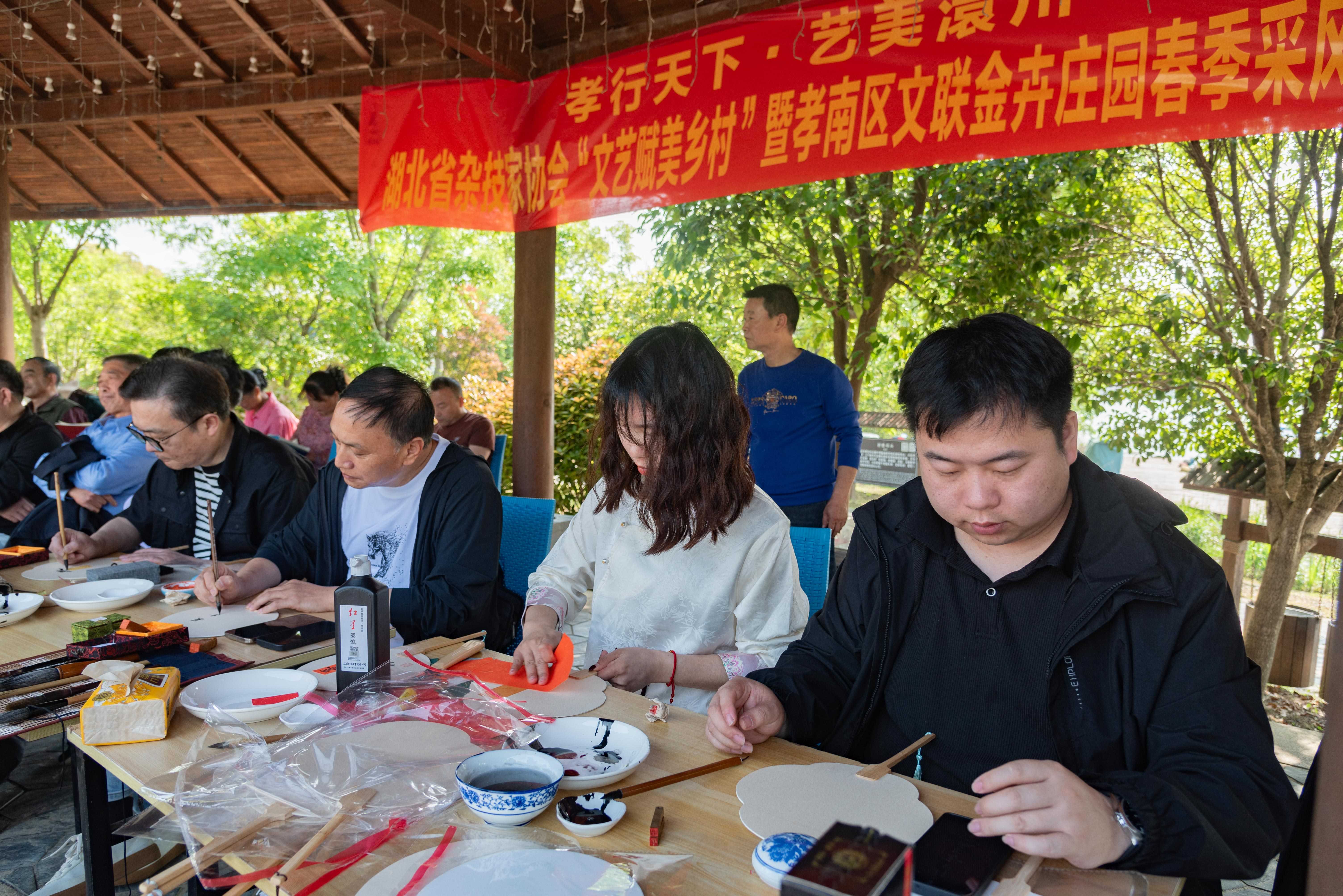 多元采风并行,激活创作基地生态。 省杂技家协会一行实地参观考察金卉庄园,深入商谈项目合作。区文联在园内广场廊亭开展“文选故里·艺美澴川”送书画进景区活动,书画家应游人之请绘制团扇,配套举办“阅享有版权的春天”区文联协会原创作品集展示。区作家协会开展“‘阅’享金卉·‘读’揽春光”阅读分享,区美术家协会开展“写意金卉·艺创生活”主题写生,区摄影家协会开展“孝行天下·艺美澴川”主题采风。近百名文艺创作者漫步春日园区,以笔墨、镜头汲取创作养分,让挂牌创作基地从“牌子”变成“场子”,从物理空间转化为创作生态。