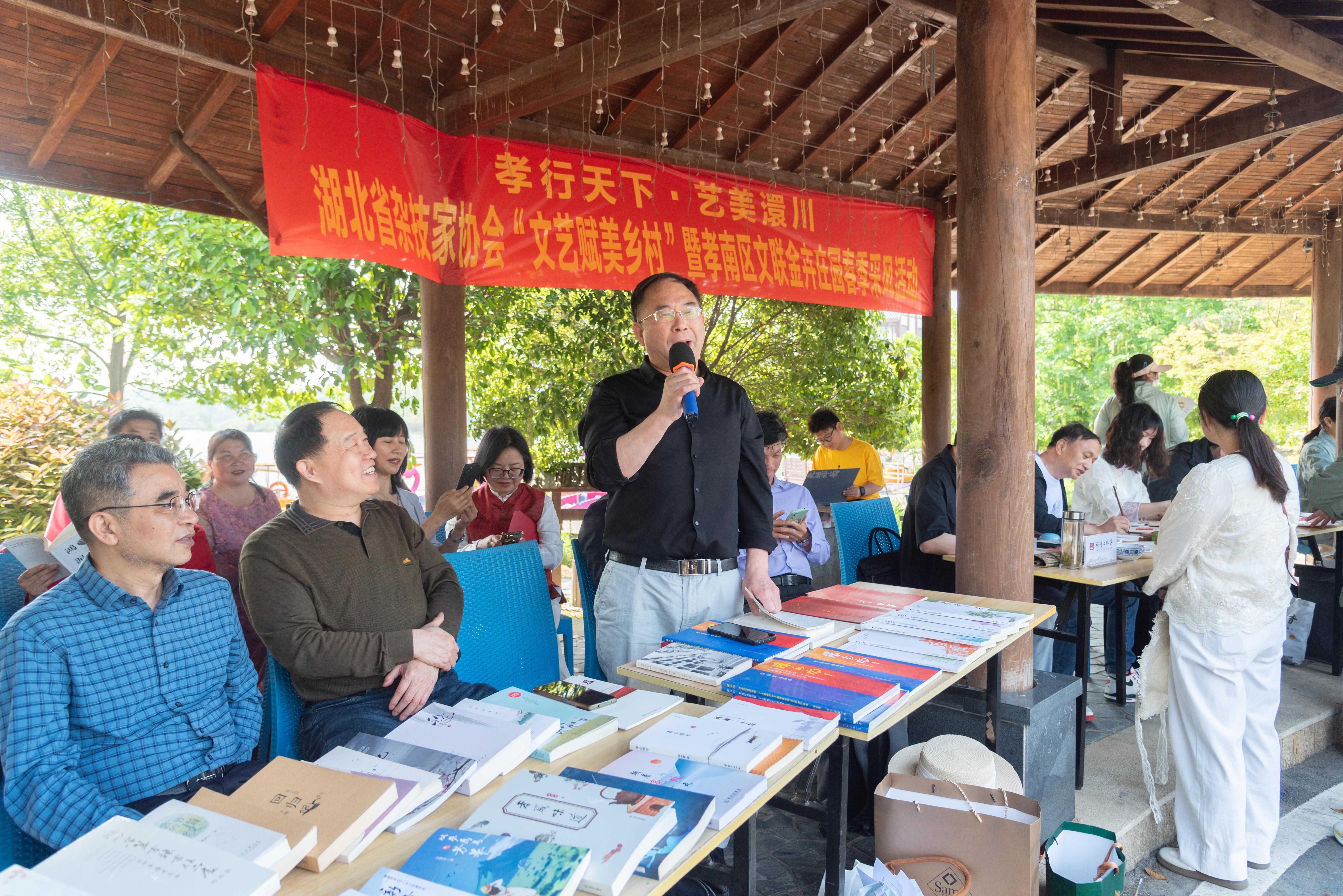 4月19日,一场沉浸式文艺采风在金卉庄园举行,为全国首个全民阅读活动周和全国知识产权宣传周提前鸣锣。“孝行天下·艺美澴川”湖北省杂技家协会“文艺赋美乡村”暨孝南区文联金卉庄园春季采风活动,在孝南区文联挂牌文艺创作基地金卉庄园举行。湖北省杂技家协会驻会副主席兼秘书长李甲杰,安徽省杂技家协会副主席、临泉县豪杰杂技艺术学校校长侯杰等杂技界人士,孝感市文联党组书记、主席鲁晓丽,孝南区委常委、宣传部部长侯昱峰等领导出席活动。区文联、朋兴乡党委政府、区作家协会、区书法家协会、区美术家协会、区摄影家协会、书画艺术工作室及媒体记者等近百人参加。