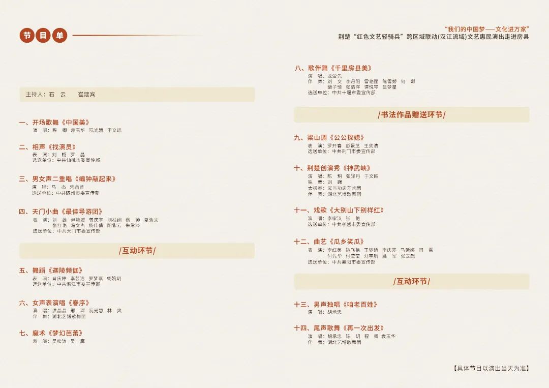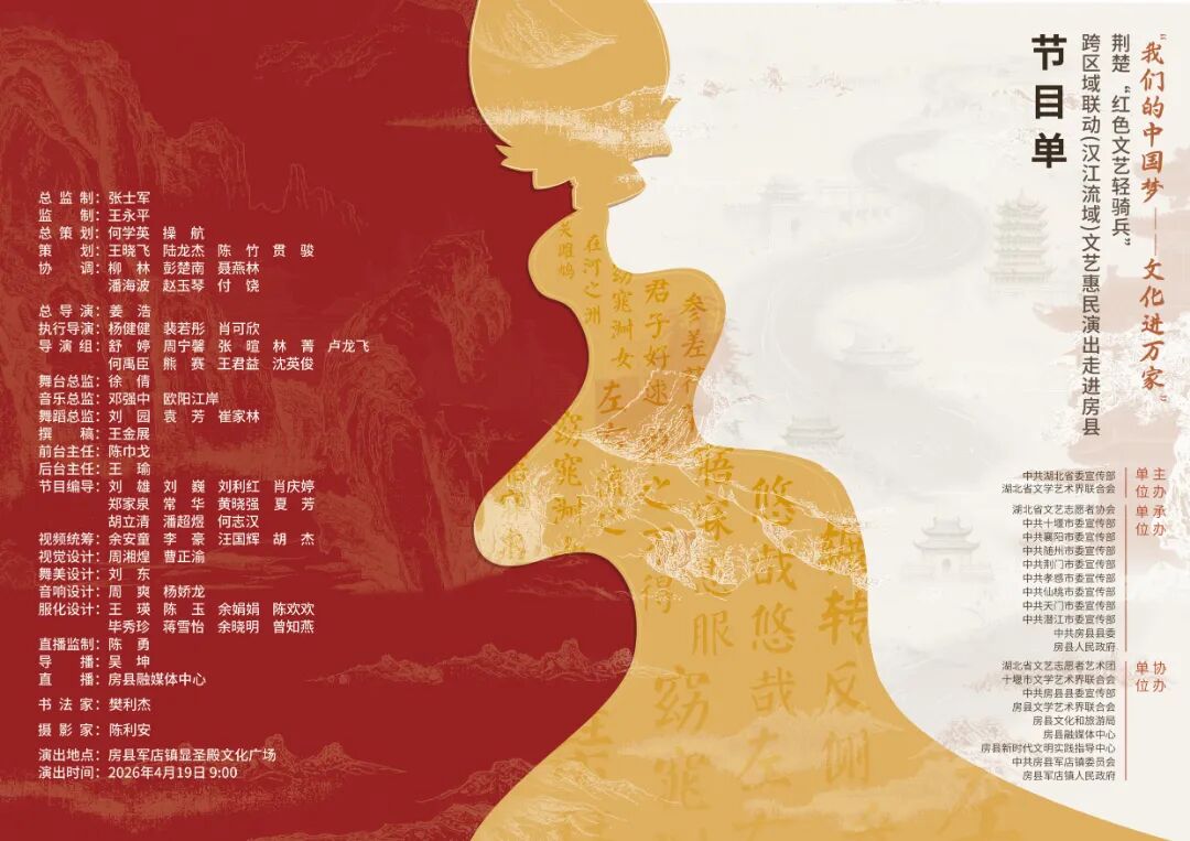 本次活动由中共湖北省委宣传部、湖北省文学艺术界联合会主办,湖北省文艺志愿者协会,十堰、襄阳、随州、荆门、孝感、仙桃、天门、潜江市委宣传部,中共房县县委、房县人民政府共同承办。下一步,荆楚“红色文艺轻骑兵”将继续深入城乡基层,开展更多形式多样、贴近民心的文艺惠民活动,让文艺之花绽放在荆楚大地,为湖北加快建成中部地区崛起重要战略支点贡献文艺力量。